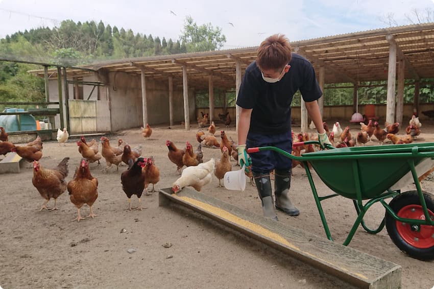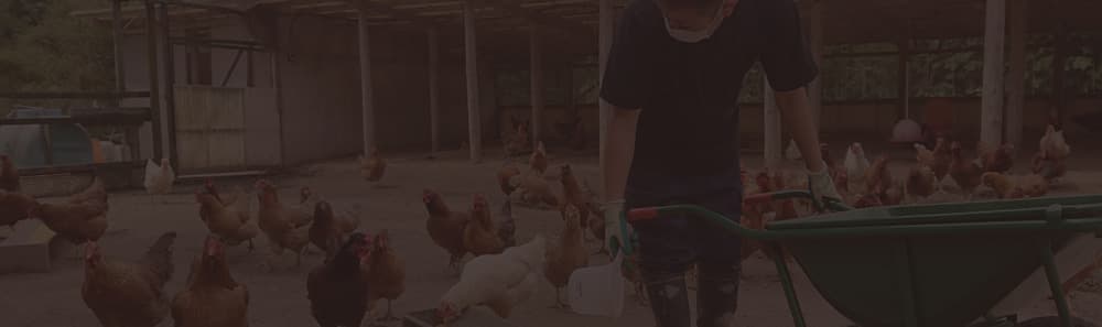 生産者は鶏の目線で腰を屈めてお世話を続けます。